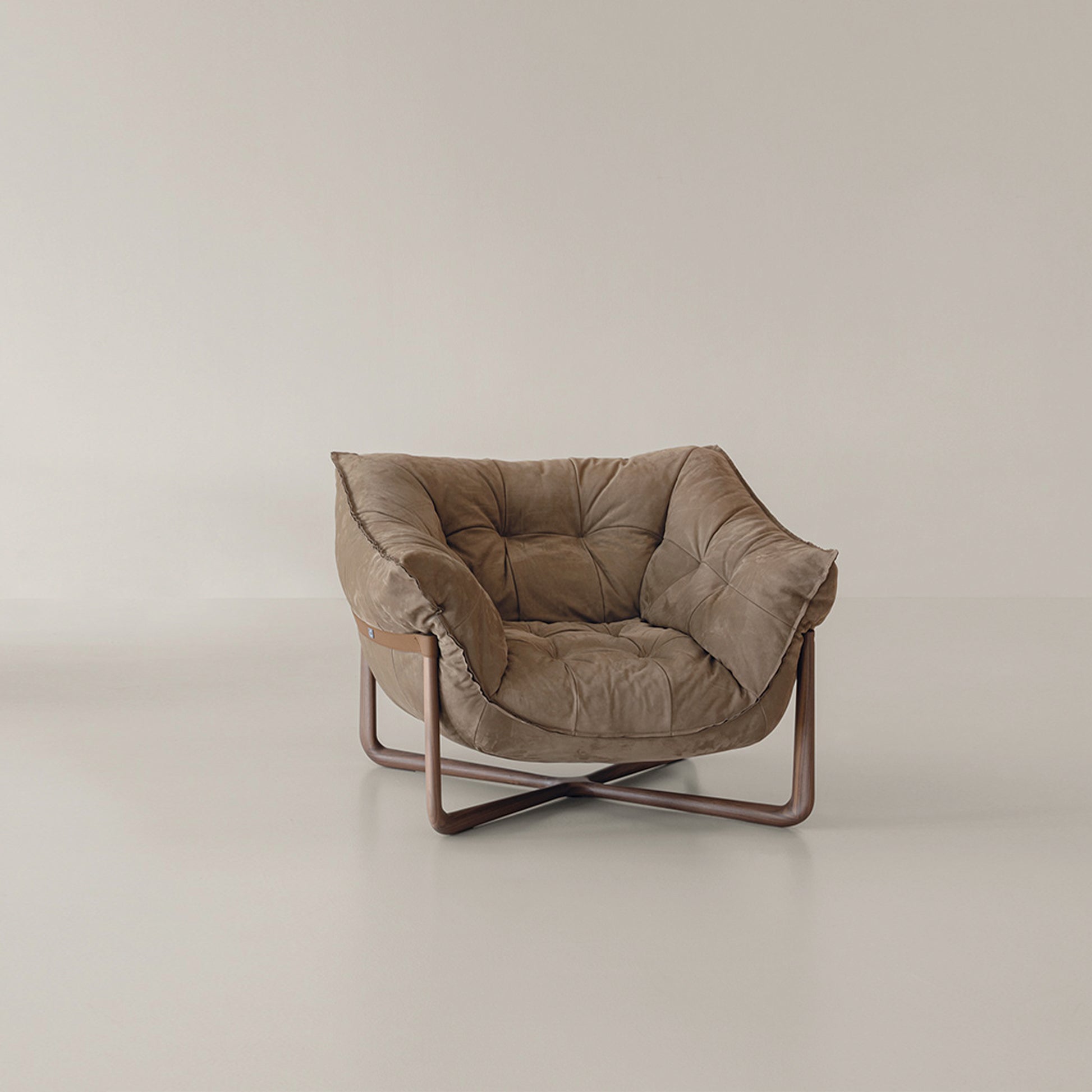 Exquisite Details: Präzise Nähte und dekorative Lederriemen verbinden Sitzfläche und stabile Holzstruktur auf elegante Weise. Die gekreuzten Beine verleihen dem Sessel eine moderne, grafische Note und schaffen ein ausgewogenes Verhältnis zwischen visueller Leichtigkeit und Robustheit.
