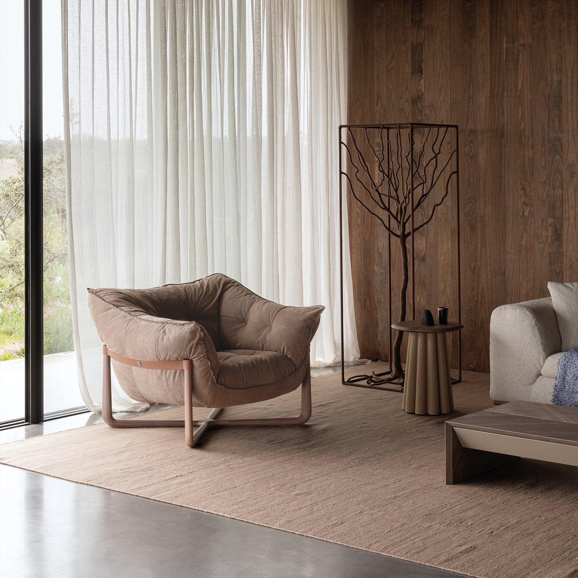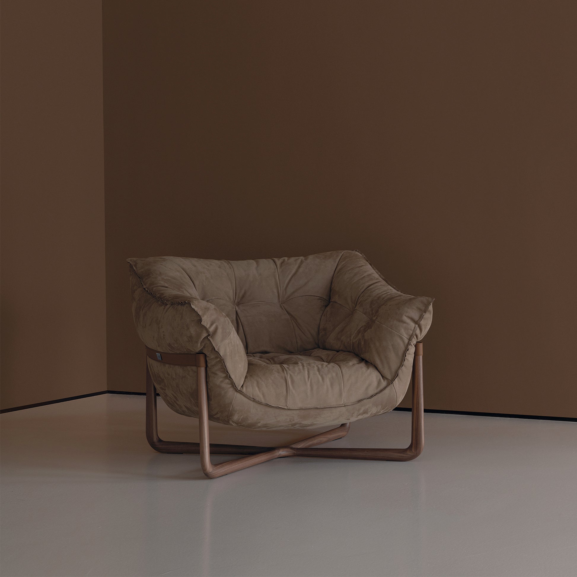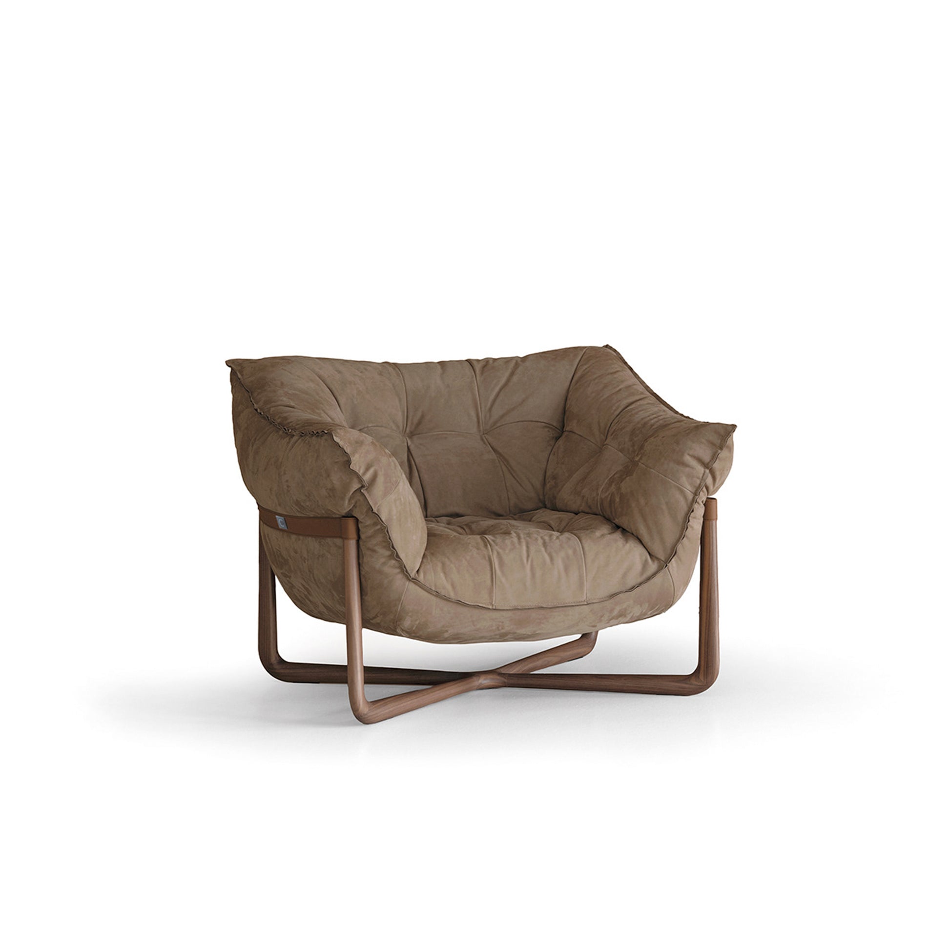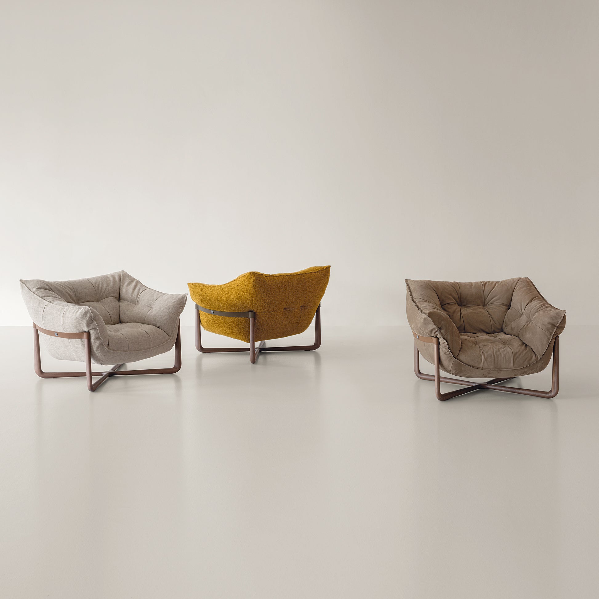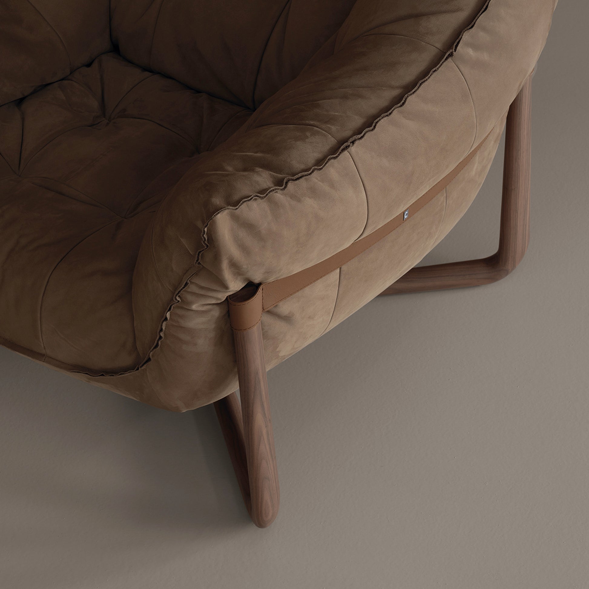 - Hochwertige Materialien: Der Metallrahmen mit elastischen Gurten ist mit Polyurethanschaum unterschiedlicher Dichte und einer doppelten Schicht silikonisierter Acrylfaser gepolstert. Die äußeren Lederriemen sind in den Varianten Soffio, Setanil und Natural Velour erhältlich. Die Massivholz-Basis gibt es in zwei Ausführungen: gebleichter Canaletto-Walnuss und schwarzer Esche.